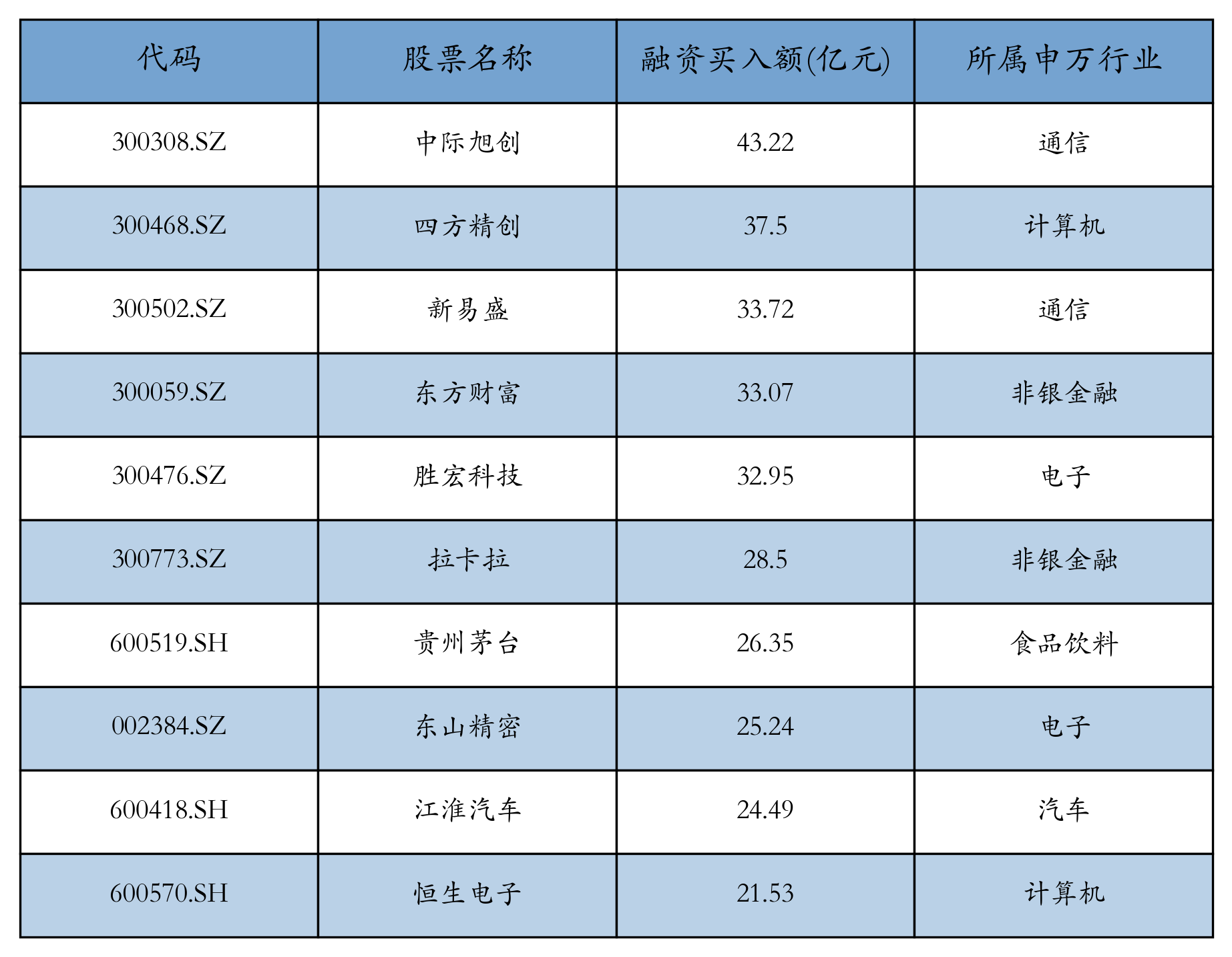 上周两市共有3414只个股有融资资金买入,共有43只个股买入金额超10亿元,其中中际旭创、四方精创、新易盛排名前三,买入金额分别43.22亿元、37.5亿元、33.72亿元。融资买入额前10个股详情见下表: