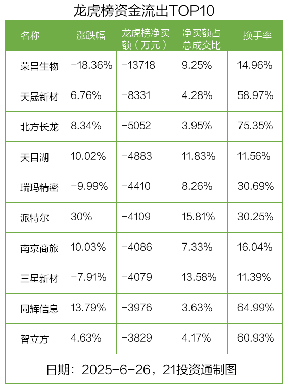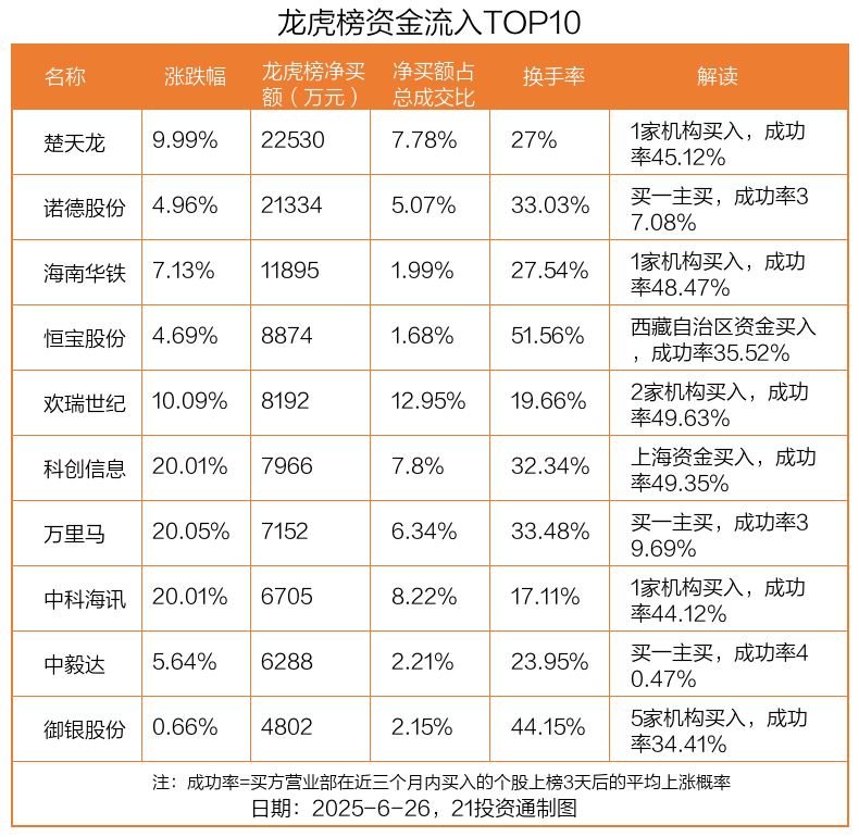 6月26日,上证指数下跌0.22%,深证成指下跌0.48%,创业板指下跌0.66%。盘后龙虎榜数据显示,共有59只个股因当日异动登上龙虎榜,资金净流入最多的是楚天龙(003040.SZ),达2.25亿元。