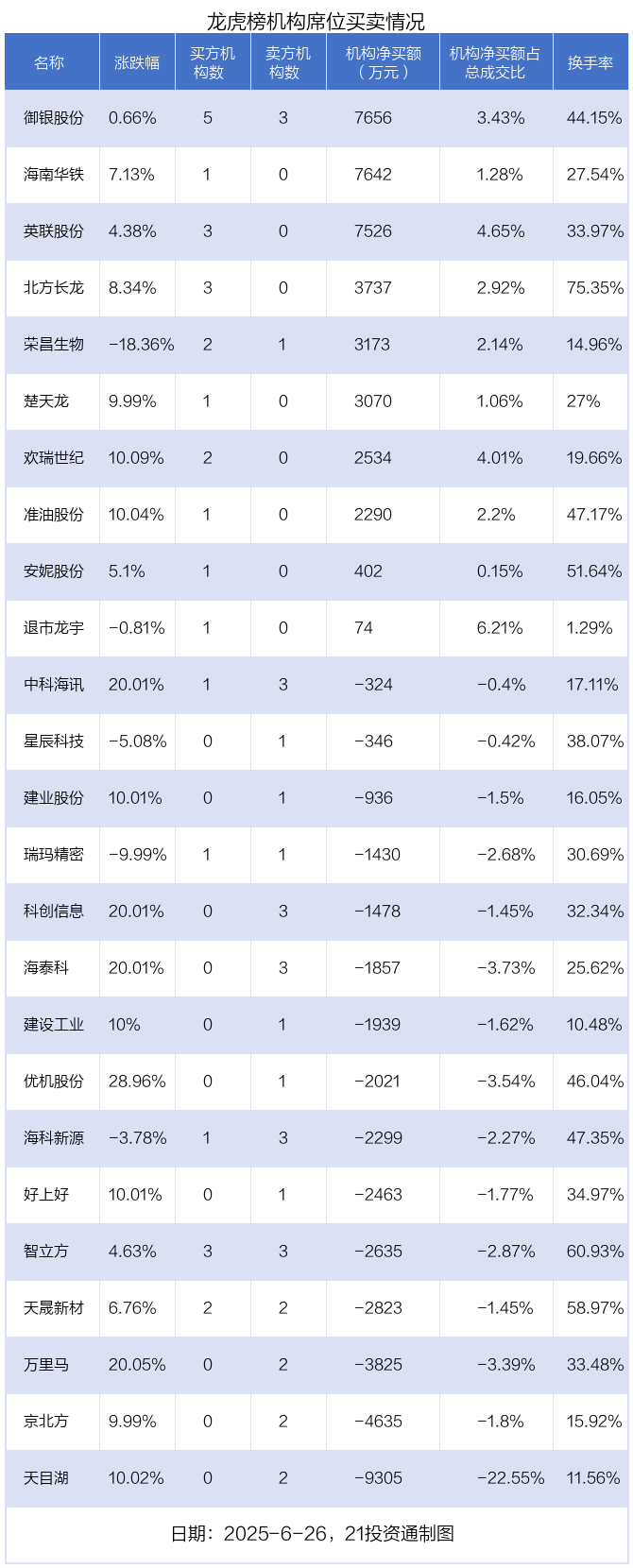 6月26日,25只个股龙虎榜出现了机构的身影,机构合计净卖出213.44万元。具体来看,机构净买入10股,净卖出15股。
