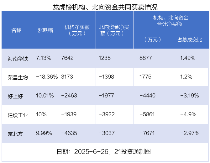 值得注意的是,机构和北向资金共同净买入了海南华铁;共同净卖出了好上好、京北方、建设工业等3股;在荣昌生物上出现分歧,机构净买入荣昌生物3172.88万元,北向资金净卖出1398.12万元。