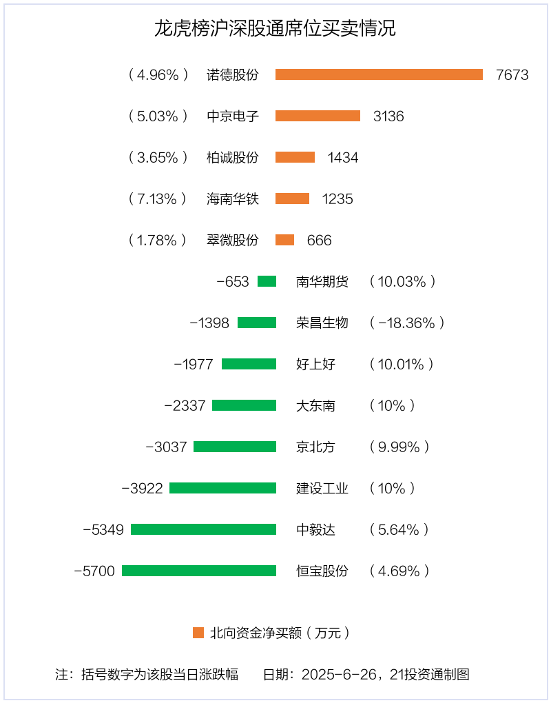 北向资金净买入金额最多的是诺德股份(600110.SH),净买入7672.67万元,占总成交金额的1.82%。净卖出金额最多的是恒宝股份(002104.SZ),为5699.79万元,占总成交金额的1.08%,当日收盘上涨4.69%,换手率为51.56%。