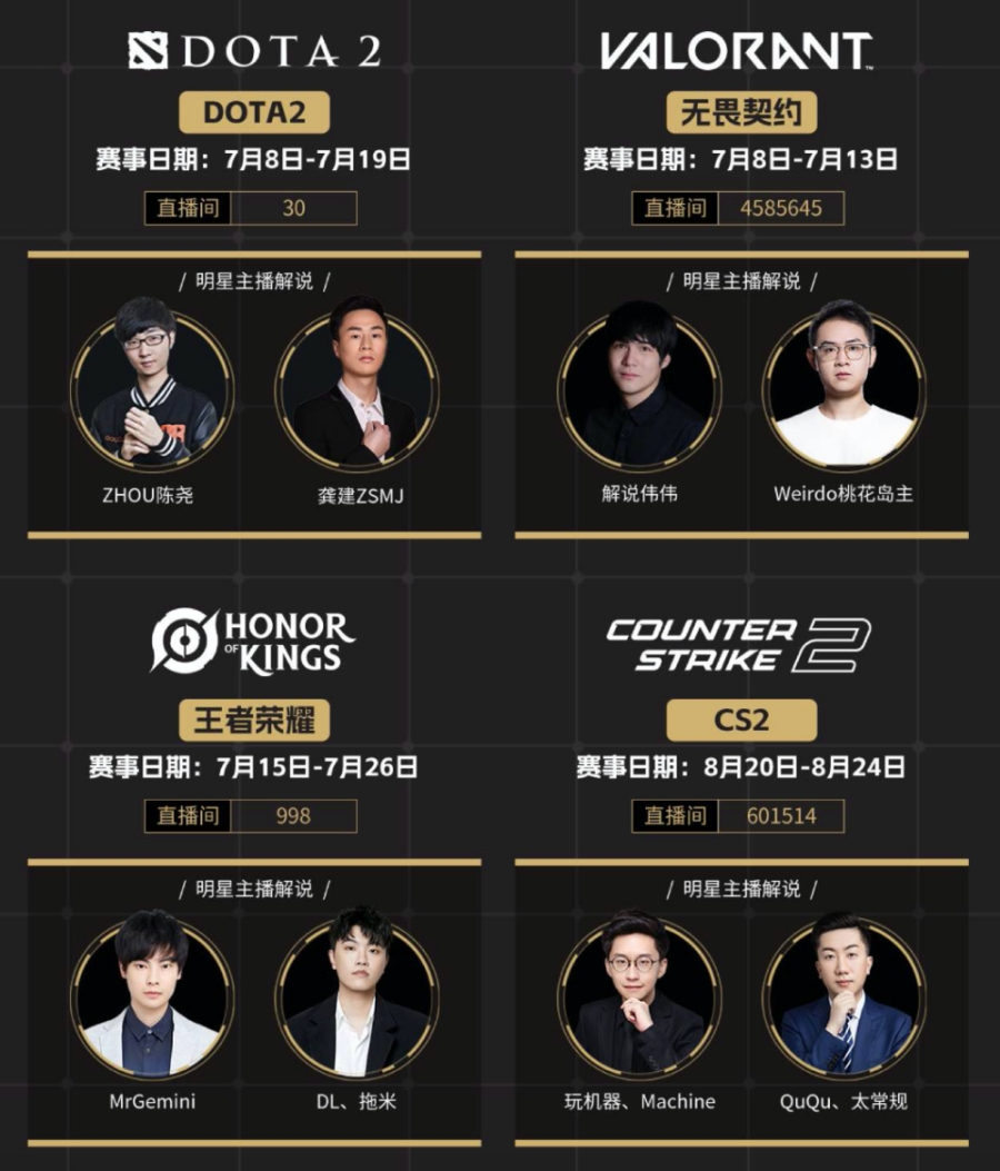 7月8日17时,无畏契约、DOTA2两大热门赛事率先开赛,BLG、XLG、TEC、EDG以及XG五支CN战队均在开赛日迎来首战。而王者荣耀、CF和CS2将分别于7月15日、8月19日、8月20日开赛,8月期间还有云顶之弈、街霸6、守望先锋等超多精彩赛事。