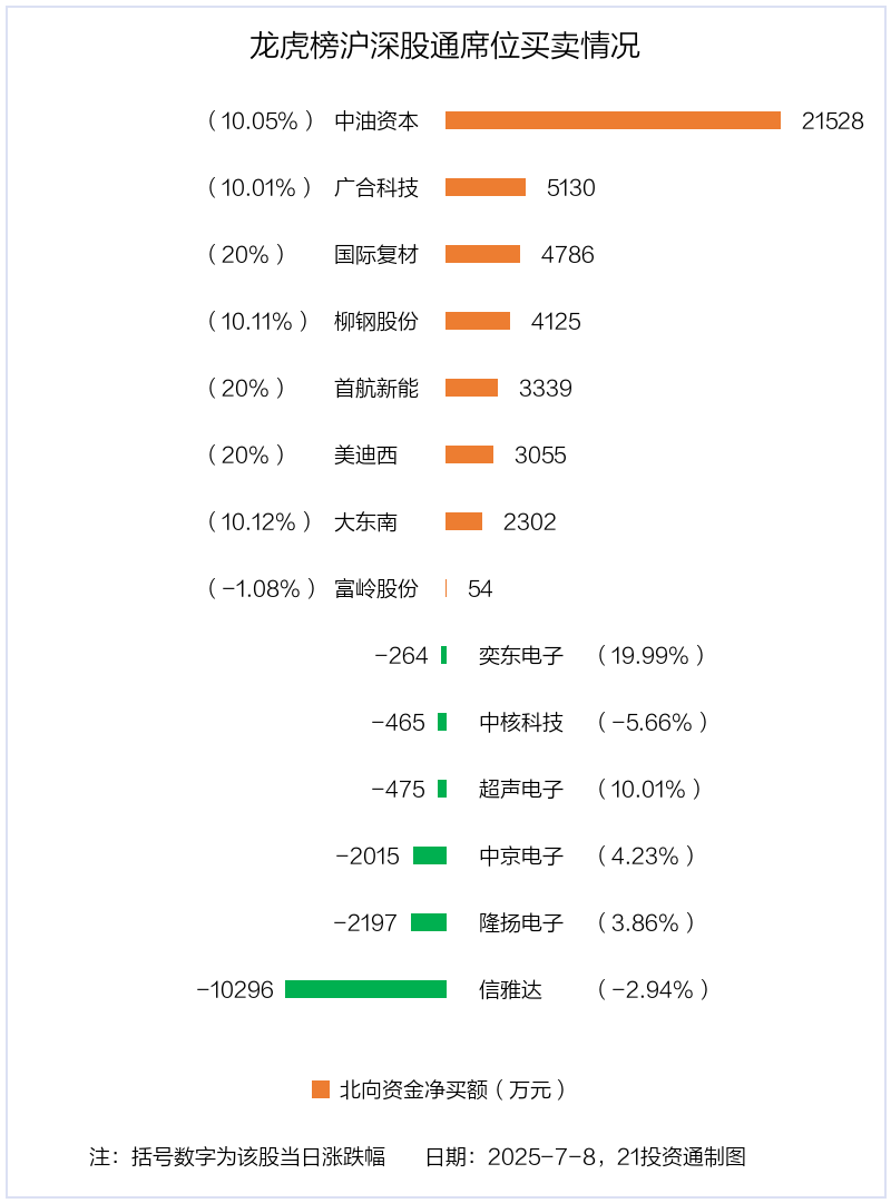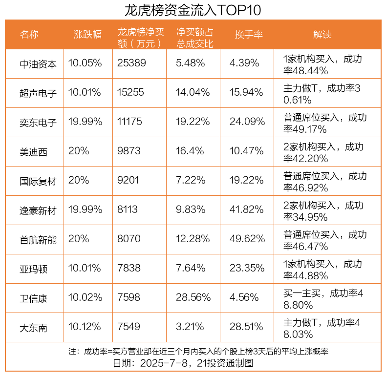 7月8日,上证指数上涨0.7%,深证成指上涨1.46%,创业板指上涨2.39%。盘后龙虎榜数据显示,共有49只个股因当日异动登上龙虎榜,资金净流入最多的是中油资本(000617.SZ),达2.54亿元。