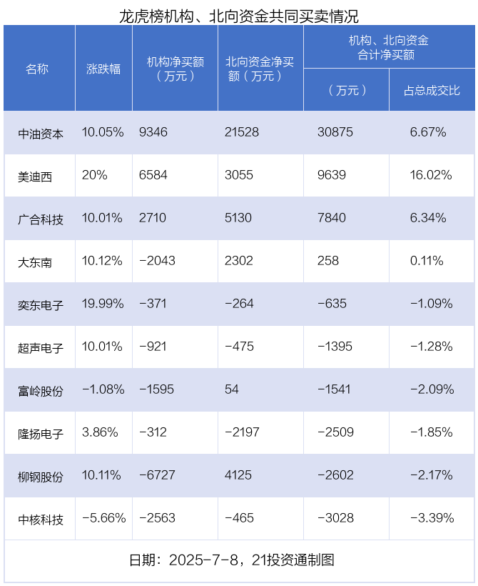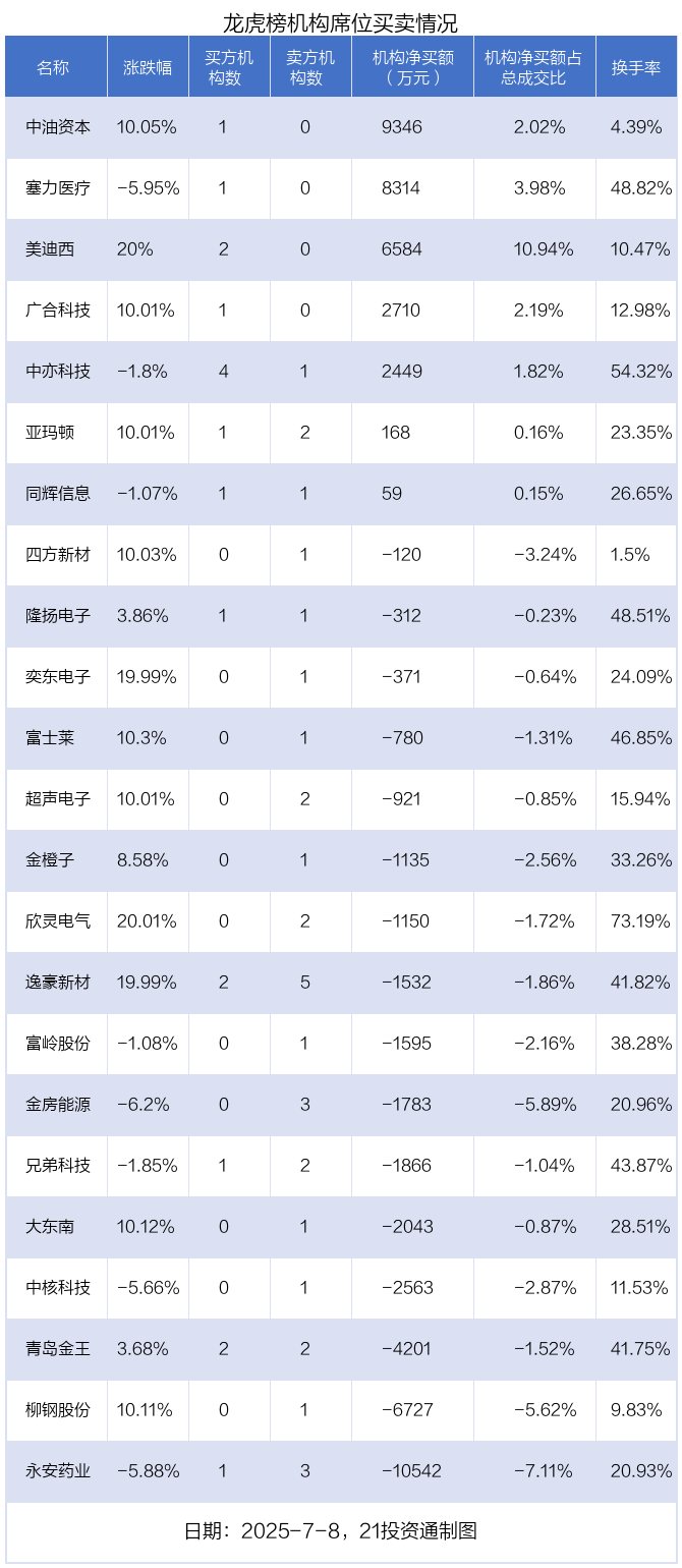 其中,机构净买入金额最多的是中油资本(000617.SZ),当日收盘上涨10.05%,换手率为4.39%。