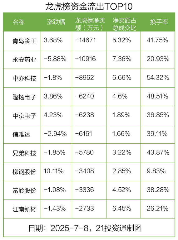 而龙虎榜中资金净流出最多的是青岛金王(002094.SZ),被净卖出为1.47亿元,占总成交金额的5.32%。青岛金王收盘上涨3.68%,换手率为41.75%。