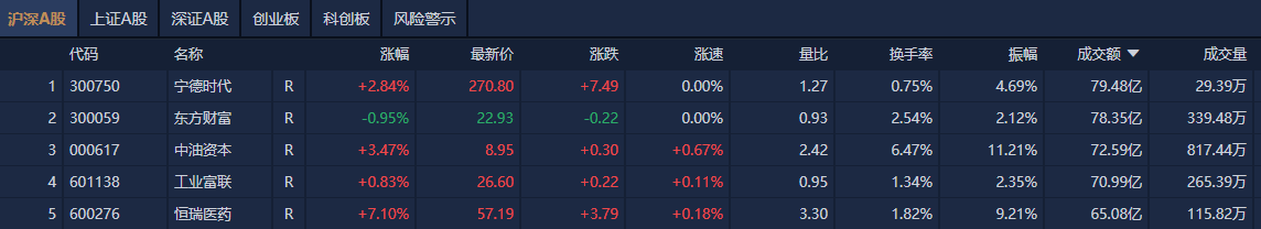 沪深两市全天成交额1.51万亿元,较上个交易日放量512亿。个股方面,宁德时代成交额79.48亿元居首,东方财富、中油资本、工业富联等全天成交额均在70亿元以上。