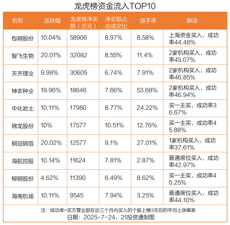 7月24日,上证指数上涨0.65%,深证成指上涨1.21%,创业板指上涨1.5%。盘后龙虎榜数据显示,共有51只个股因当日异动登上龙虎榜,资金净流入最多的是包钢股份(600010.SH),达5.89亿元。