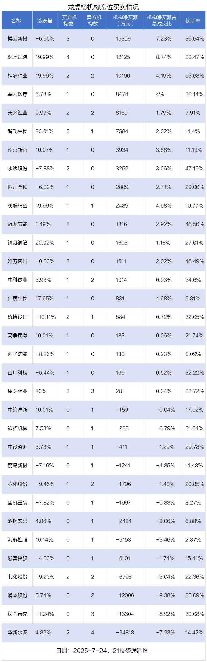 7月24日,33只个股龙虎榜出现了机构的身影,机构合计净买入5768.85万元。具体来看,机构净买入20股,净卖出13股。