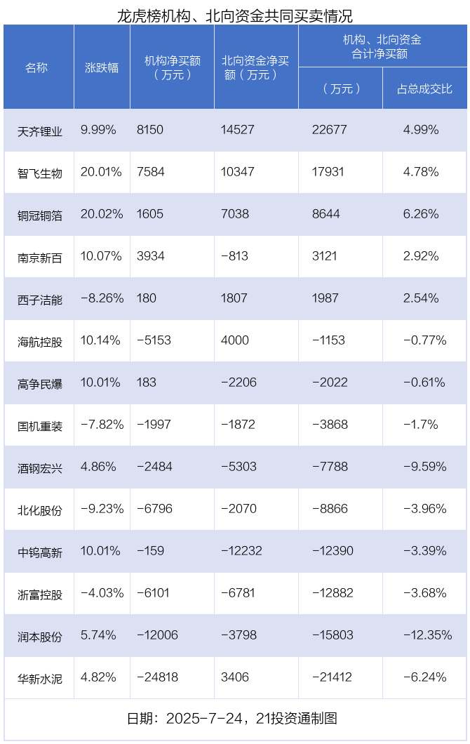 值得注意的是,机构和北向资金共同净买入了天齐锂业、智飞生物、铜冠铜箔、西子洁能等4股;共同净卖出了国机重装、北化股份、润本股份、酒钢宏兴、浙富控股、中钨高新等6股;在海航控股,华新水泥,南京新百,高争民爆上出现分歧,机构净卖出海航控股5152.97万元,北向资金净买入3999.75万元;机构净卖出华新水泥2.48亿元,北向资金净买入3405.81万元;机构净买入南京新百3934.08万元,北向资金净卖出813.43万元;机构净买入高争民爆183.27万元,北向资金净卖出2205.64万元。