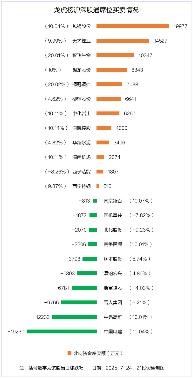 7月24日,北向资金参与龙虎榜中的个股共有22只,合计净买入2.1亿元。其中沪股通净买入6 股,净卖出5 股,合计净买入5692.01万元;深股通净买入6 股,净卖出5 股,合计净买入1.53亿元。