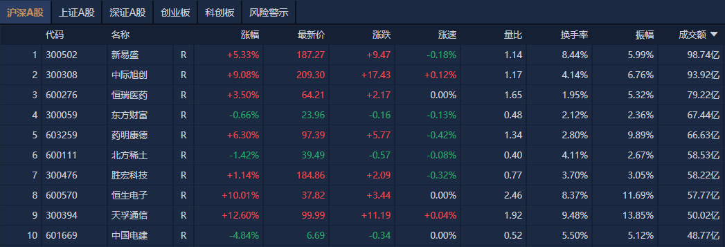 沪深两市半日成交额1.13万亿元,较上个交易日放量67.3亿。个股方面,新易盛成交额超98亿元居首,中际旭创、恒瑞医药、东方财富成交额靠前。