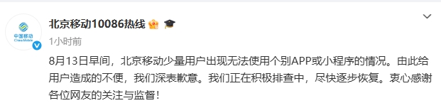 对此,@北京移动10086热线 发布情况说明称:“早间,北京移动少量用户出现无法使用个别APP或小程序的情况。由此给用户造成的不便,我们深表歉意。我们正在积极排查中,尽快逐步恢复。 ”