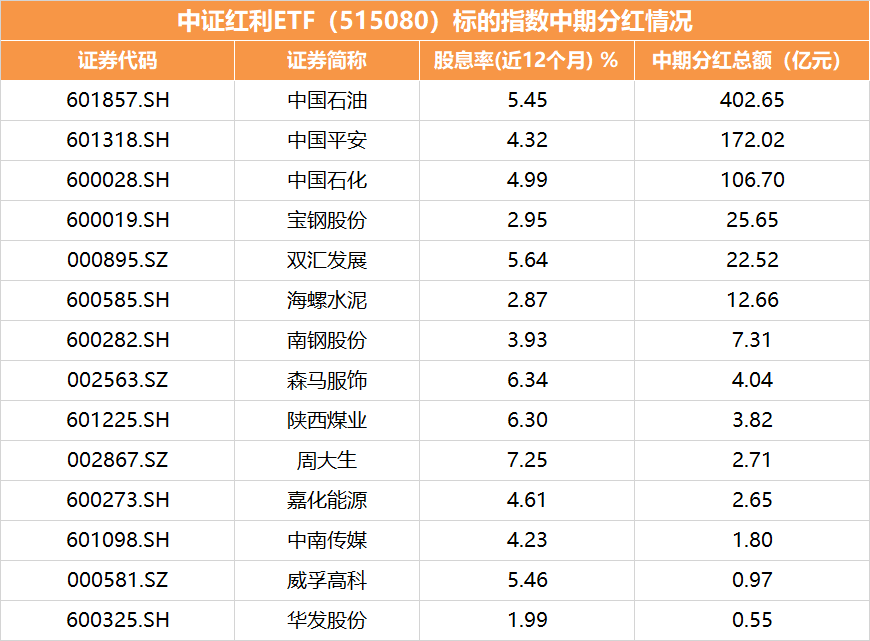 Wind数据显示,近期上市公司中期财报季,中证红利14只成份股官宣中期分红,合计分红金额超766亿元。中国石油分红金额近403亿元,中国平安、中国石化分别分红172亿元、106.7亿元,宝钢股份、双汇发展分红金额均在20亿元以上,此外海螺水泥分红12.66亿元,南钢股份、森马服饰、陕西煤业、周大生、中南传媒、威孚高科等多股同步发布中期分红公告。