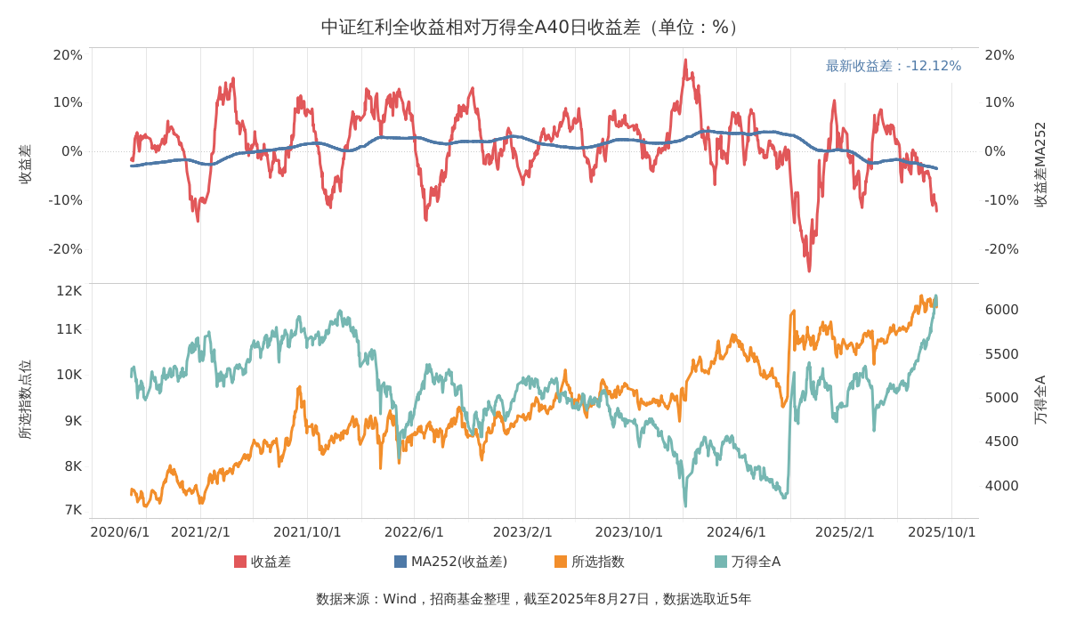 资料显示,40日收益差就是每天分别计算中证红利全收益和万得全A各自过去滚动40天的收益率,然后相减,衡量红利相对市场的超额收益水平,或者相对强度。当40日收益差在年线下方偏离过多,意味着中证红利当前跑输Wind全A比较多。