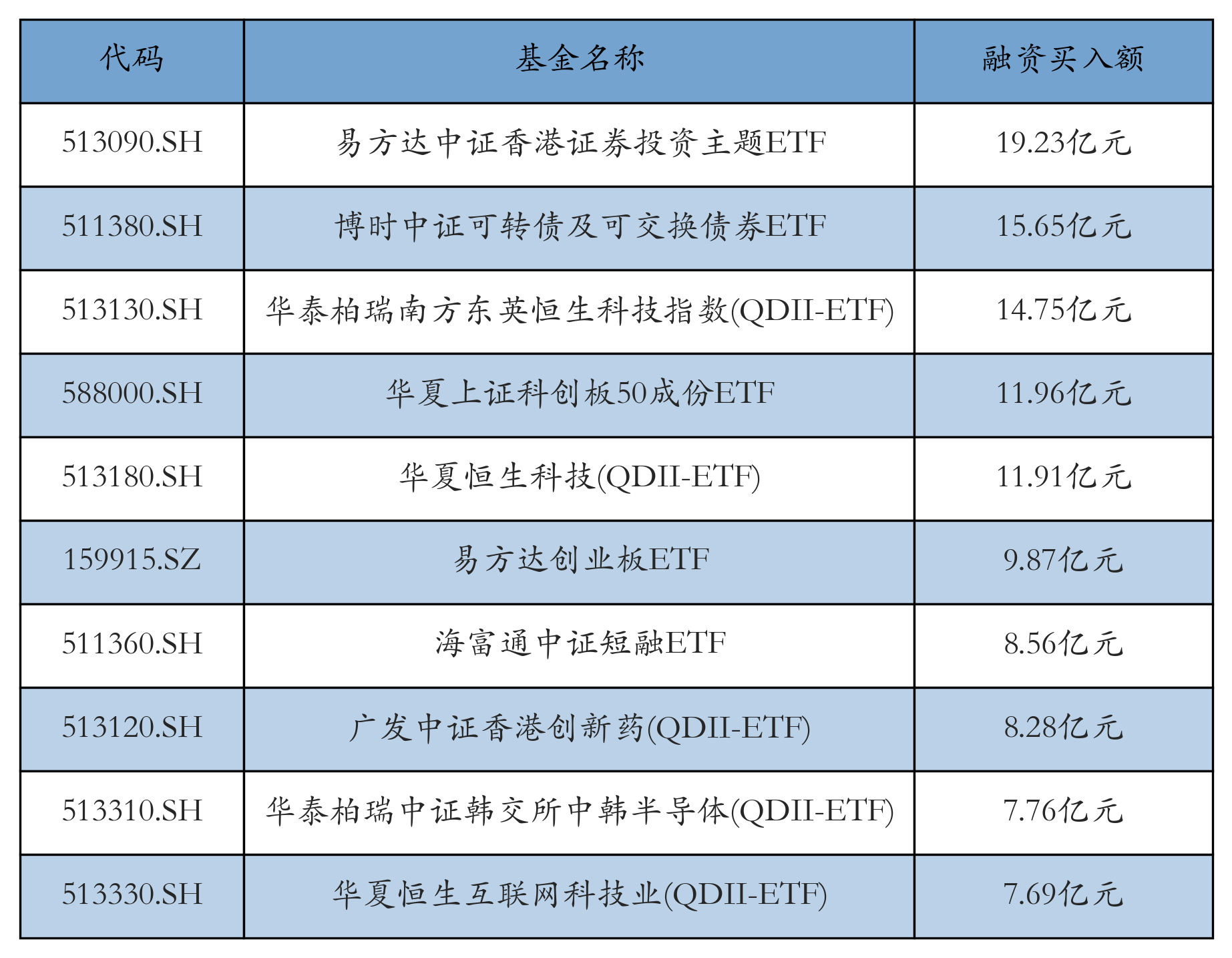 8月28日ETF融资买入额前三位分别为:易方达中证香港证券投资主题ETF(19.23亿元)、博时中证可转债及可交换债券ETF(15.65亿元)和华泰柏瑞南方东英恒生科技指数(QDII-ETF)(14.75亿元),前10具体见下表: