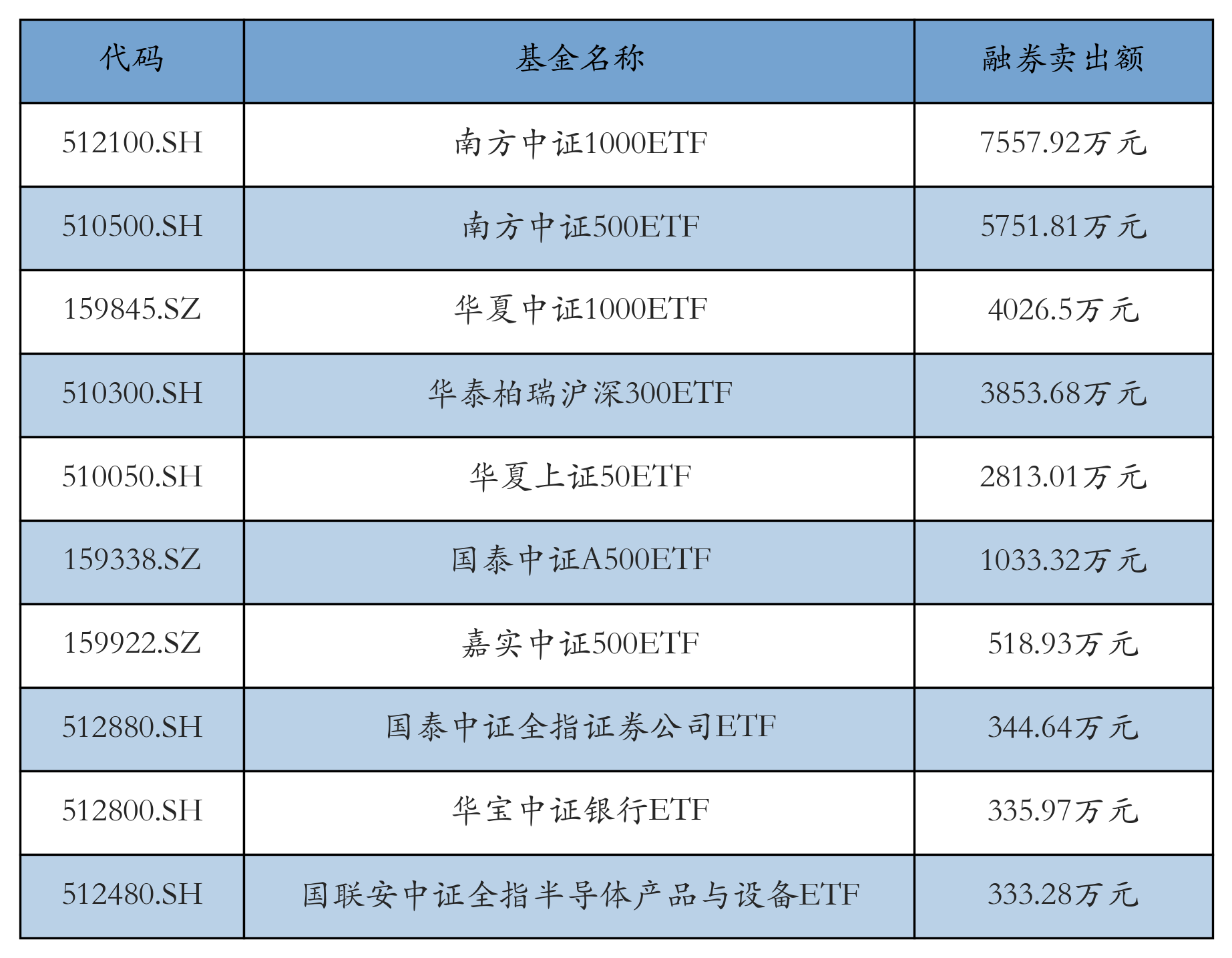 8月28日ETF融券卖出额前三位分别为:南方中证1000ETF(7557.92万元)、南方中证500ETF(5751.81万元)和华夏中证1000ETF(4026.5万元),前10具体见下表: