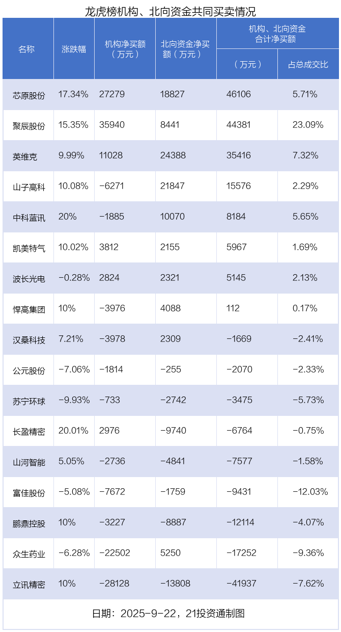 值得注意的是,机构和北向资金共同净买入了英维克、芯原股份、聚辰股份、波长光电、凯美特气;共同净卖出了公元股份、富佳股份、苏宁环球、山河智能、鹏鼎控股、立讯精密;在山子高科,中科蓝讯,众生药业,悍高集团,汉桑科技,长盈精密上出现分歧,机构净卖出山子高科6270.66万元,北向资金净买入2.18亿元;机构净卖出中科蓝讯1885.33万元,北向资金净买入1.01亿元;机构净卖出众生药业2.25亿元,北向资金净买入5249.66万元;机构净卖出悍高集团3975.64万元,北向资金净买入4087.54万元;机构净卖出汉桑科技3978.01万元,北向资金净买入2309.15万元;机构净买入长盈精密2976.41万元,北向资金净卖出9739.95万元。