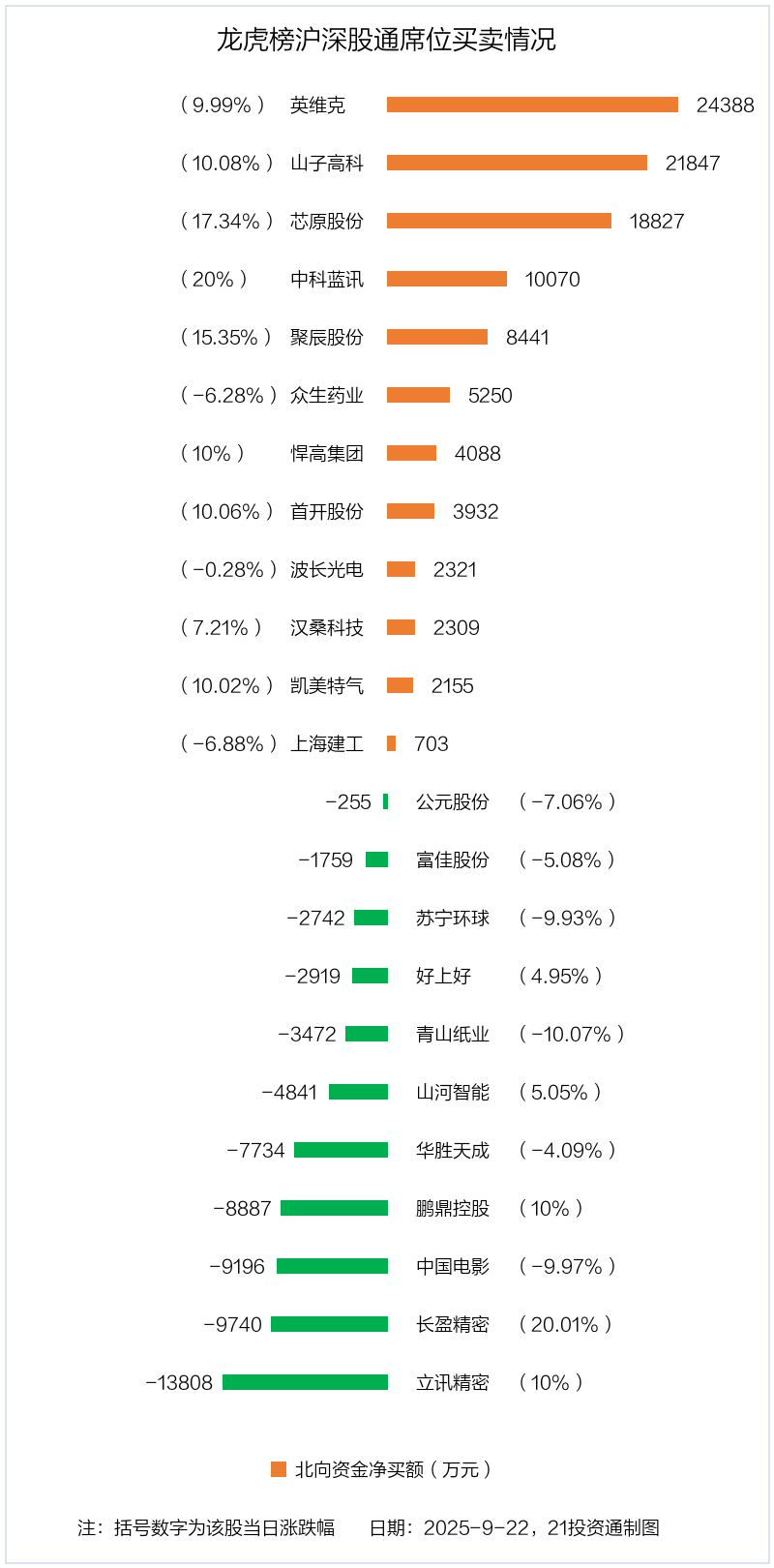 9月22日,北向资金参与龙虎榜中的个股共有23只,合计净买入3.9亿元。其中沪股通净买入5 股,净卖出4 股,合计净买入1.98亿元;深股通净买入7 股,净卖出7 股,合计净买入1.92亿元。