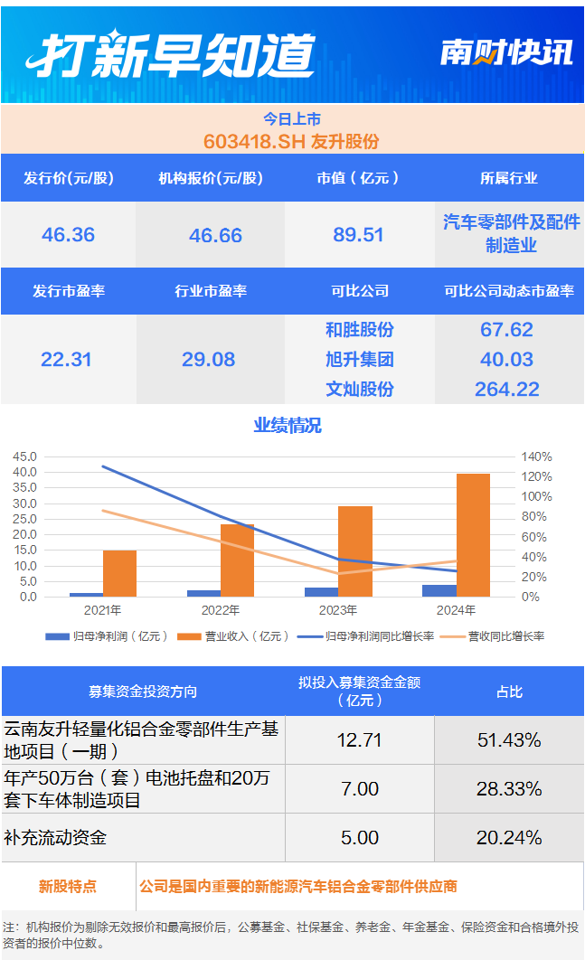 9月23日,沪市主板的友升股份(603418.SH)上市。该公司是集设计、开发、生产、销售、服务于一体的专业铝合金汽车零部件制造商,专注于轻量化汽车零部件领域;产品主要聚焦于新能源汽车领域,已经形成了门槛梁系列、电池托盘系列、保险杠系列、副车架系列等多产品体系。