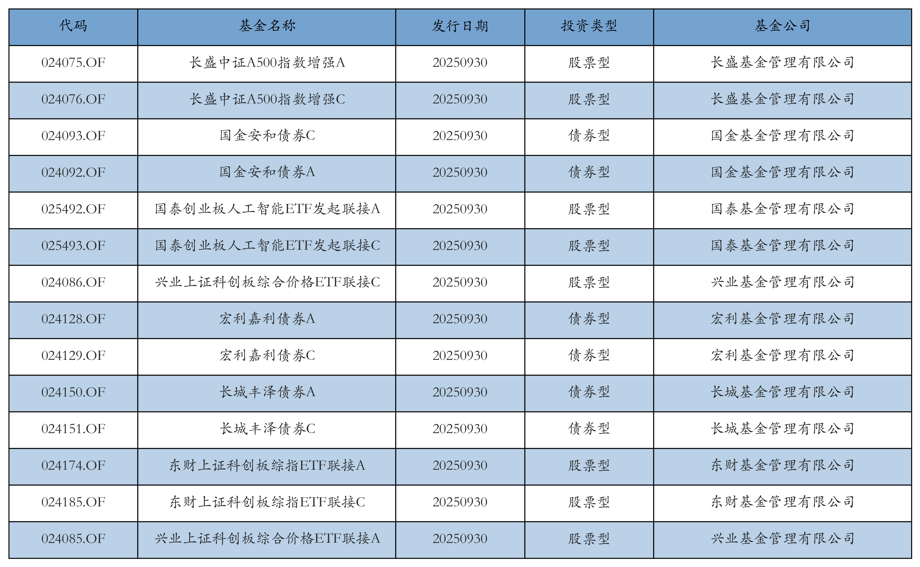 9月30日有14只新基金发行,分别为:长盛中证A500指数增强A、长盛中证A500指数增强C、国金安和债券C、国金安和债券A、国泰创业板人工智能ETF发起联接A、国泰创业板人工智能ETF发起联接C、兴业上证科创板综合价格ETF联接C、宏利嘉利债券A、宏利嘉利债券C、长城丰泽债券A、长城丰泽债券C、东财上证科创板综指ETF联接A、东财上证科创板综指ETF联接C、兴业上证科创板综合价格ETF联接A,详情见下表: