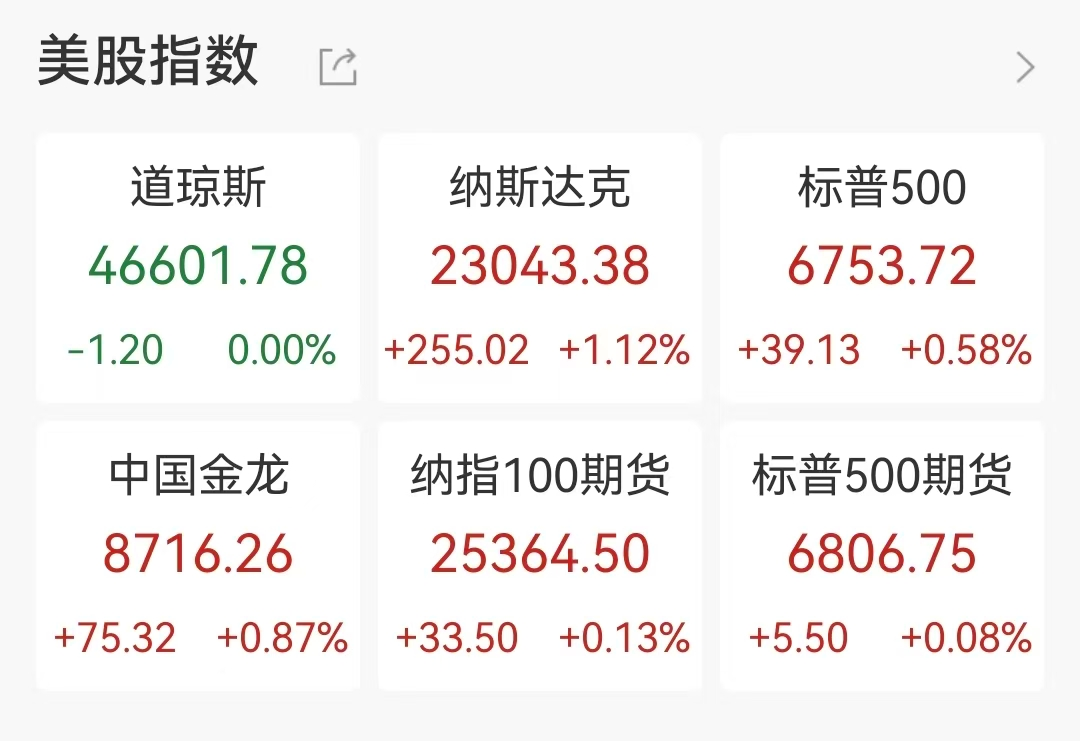 当地时间10月8日,美国三大股指多数收涨,道指持平,标普500指数涨0.58%报6753.72,纳指涨1.12%报23043.38。纳斯达克指数和标普500指数均创历史新高。
