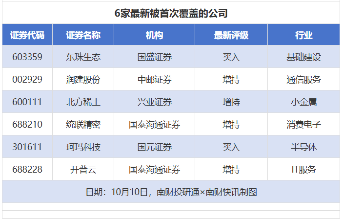 首次覆盖方面,10月10日券商共给出了6次首次覆盖,其中东珠生态获得国盛证券给予“买入”评级,润建股份获得中邮证券给予“增持”评级,北方稀土获得兴业证券给予“增持”评级,统联精密获得国泰海通证券给予“增持”评级,珂玛科技获得国元证券给予“买入”评级。