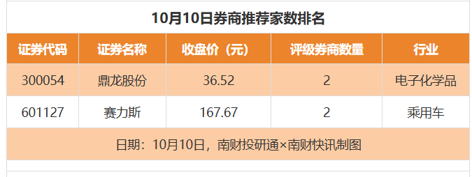 从券商推荐家数来看,10月10日有18家上市公司得到券商推荐,其中鼎龙股份获得2家推荐,赛力斯获得2家推荐,福瑞达获得1家推荐。