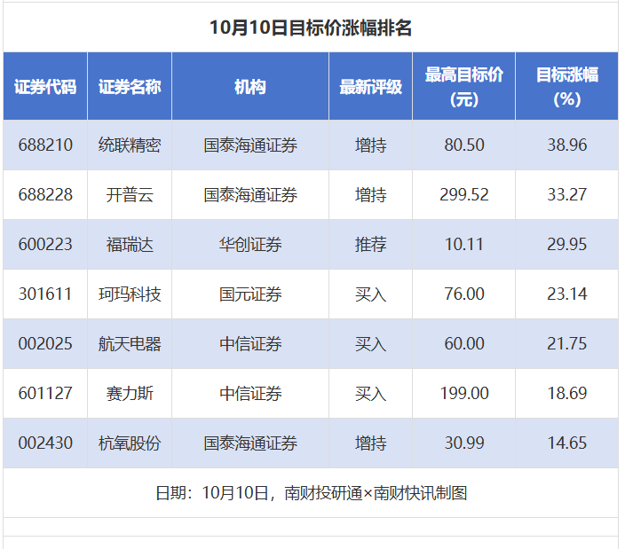 南财投研通数据显示,10月10日,券商给予上市公司目标价共7次,按最新收盘价计算,目标价涨幅排名居前的公司有统联精密、开普云、福瑞达,目标价涨幅分别为38.96%、33.27%、29.95%,分别属于消费电子、IT服务、化妆品行业。