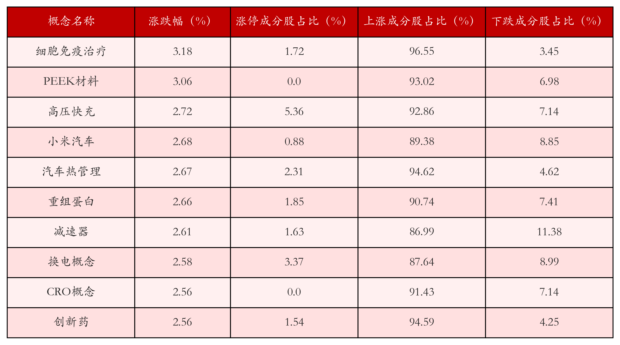 根据A股概念涨跌幅与所对应的股票池综合分析,涨幅靠前的三个概念板块分别为:细胞免疫治疗、PEEK材料与高压快充。排名前10位的概念板块相关数据见下表: