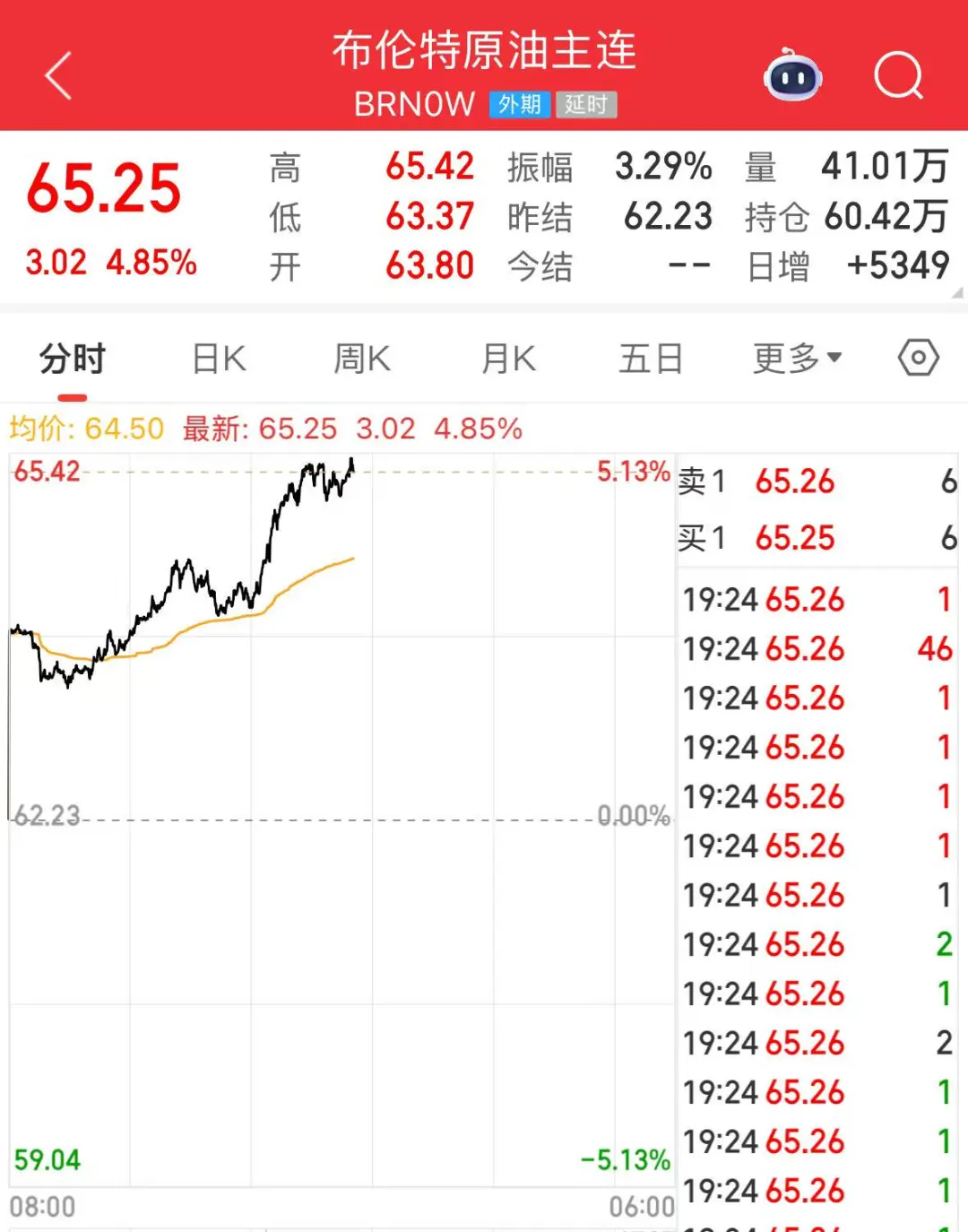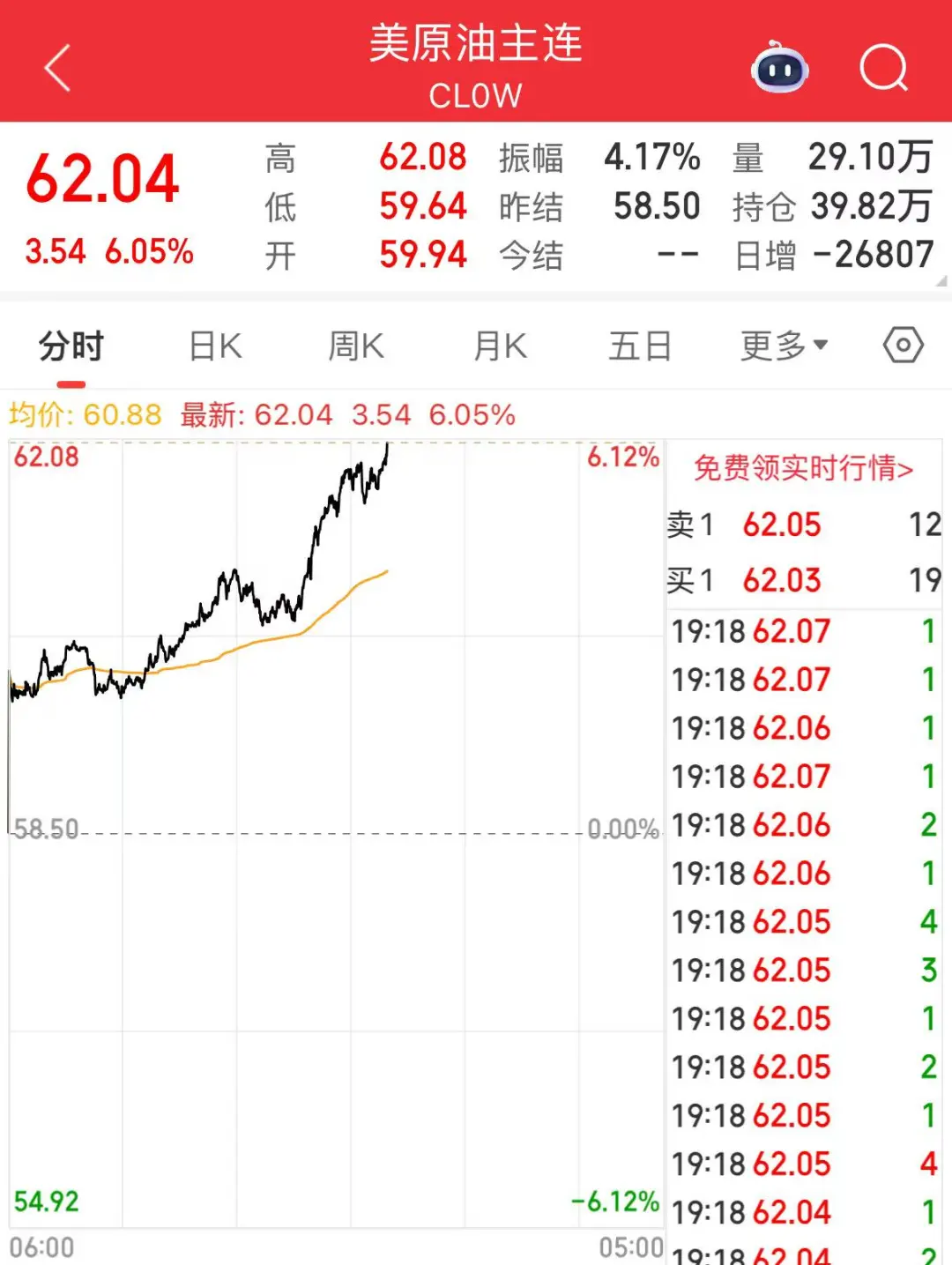 10月23日,国际油价持续走高。截至北京时间19:30,WTI原油期货涨幅超6%,报62.04美元/桶。布伦特原油涨4.85%,报65.25美元/桶。