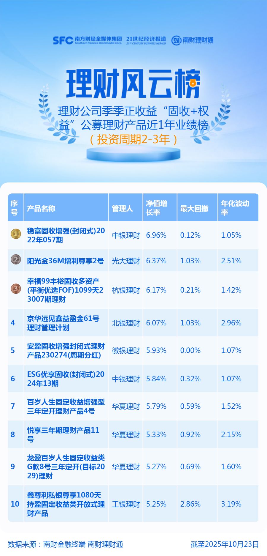 产品统计范围为理财公司发行的投资周期在2-3年(含)的公募“固收+权益”产品,统计截止日期为2025年10月23日,统计区间为近一年。