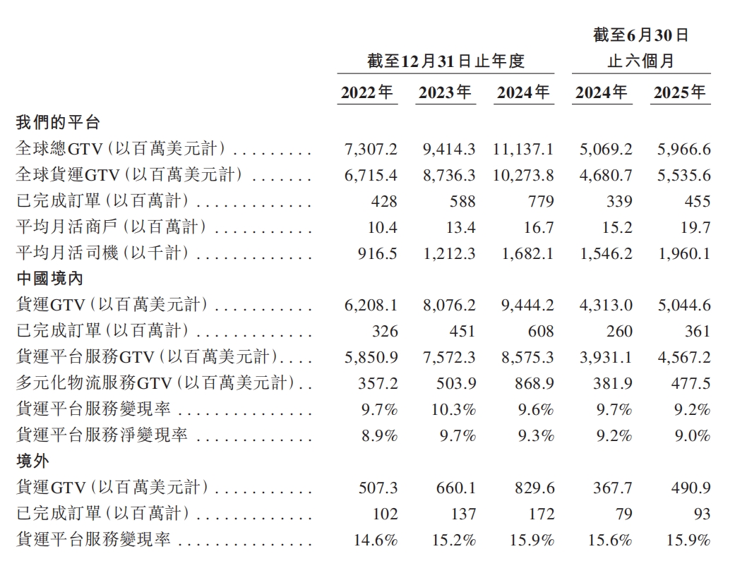 从运营数据来看,2024年货拉拉的境外货运GTV是8.3亿美元,从2022年到2024年的年复合增长率为28%,2024年境外已完成订单1.72亿,从2022年到2024年的年复合增长率是30%。据最新招股书,2025年上半年,货拉拉的境外市场收入达到8894万美元,合计占其总收入的9.5%。