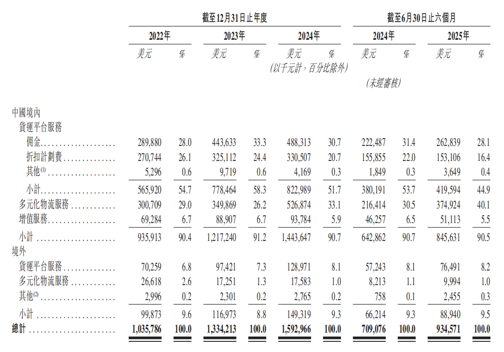 财报数据显示,在中国境内,货拉拉的多元化物流服务在2024年产生的货运GTV为8.69亿美元,较2023年的5亿美元显著增长。2025年上半年,货拉拉在中国境内营收中多元化物流服务收入占比达40.1%,较2024年上半年同比增长了近10个百分点。
