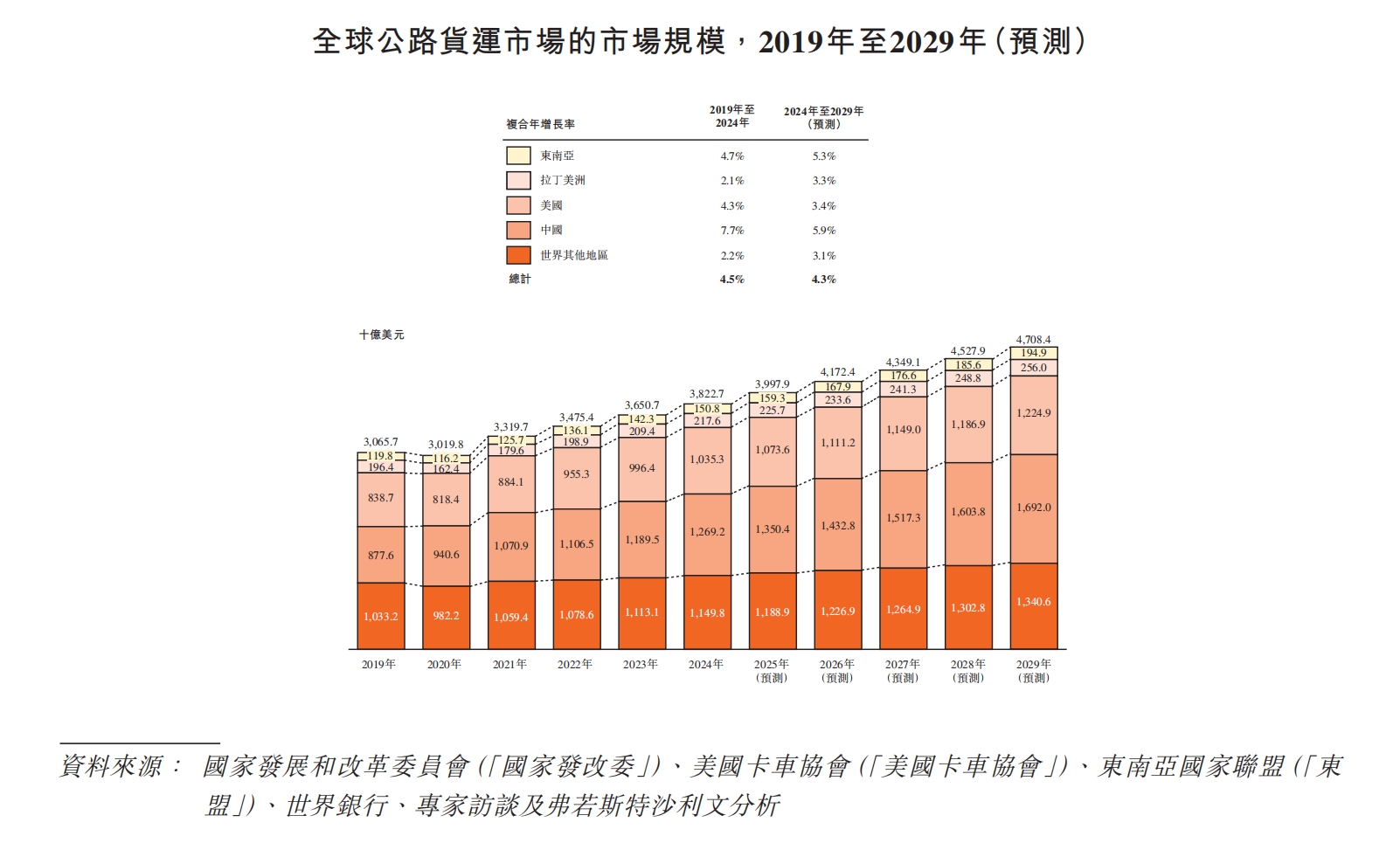 根据弗若斯特沙利文的资料,从全球市场来看,2024年全球物流支出约为11.8万亿美元,其中公路货运市场贡献了3.8万亿美元,并预计到2029年将增长至4.7万亿美元,相当于从2024年起复合年均增长率为4.3%。