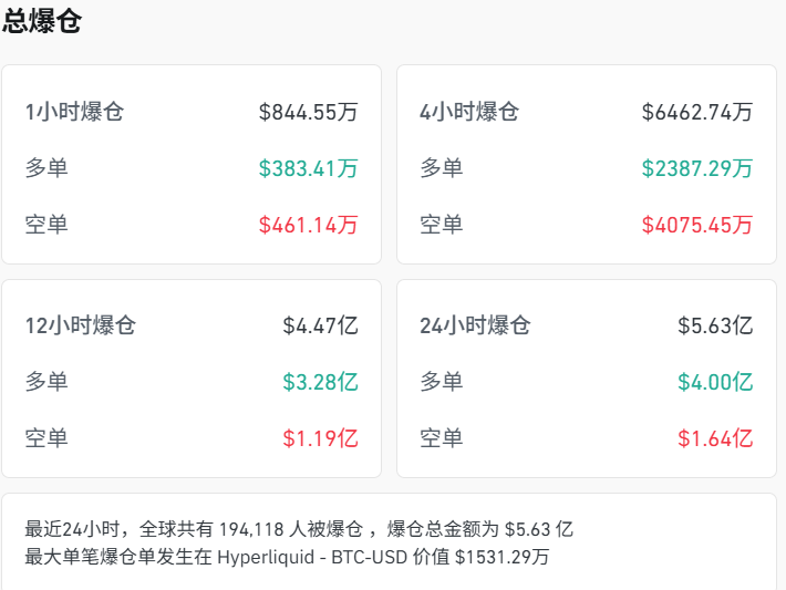 加密货币市场继续重挫,成交额集体下跌,截至北京时间6:36,近20万人被爆仓,爆仓金额5.63亿美元。