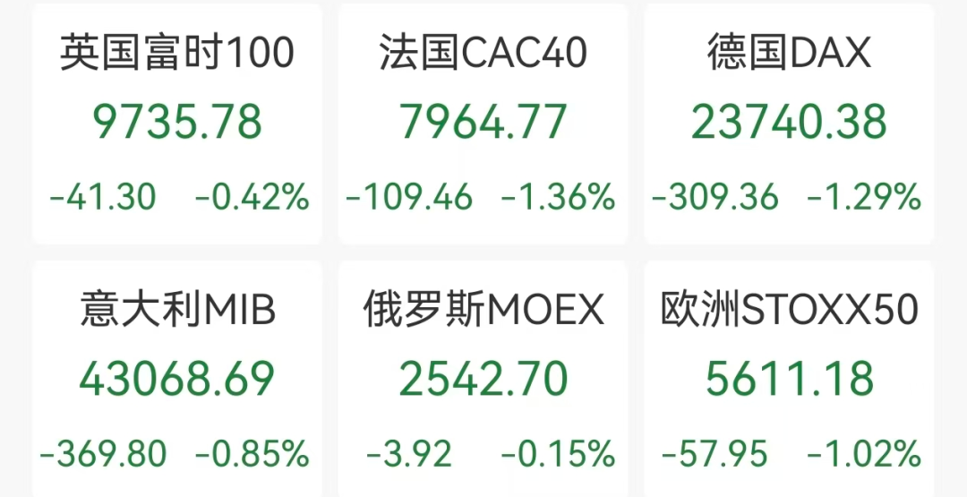 欧洲股市集体收跌,德国DAX指数、法国CAC40指数跌超1%。