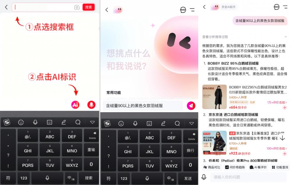 京东创新性地引入了AI智能推荐系统,消费者只需输入期望的羽绒种类、充绒量、蓬松度、含绒量、保暖等级、款式风格、价格区间等需求,系统就会从经过严格筛选的商品池中精准匹配最适合的羽绒服。同时针对羽绒制品的相关指标与保养知识也会给消费者进行详细的介绍,帮助消费者选购更适合自己的羽绒制品以及更妥善的保养方法。
