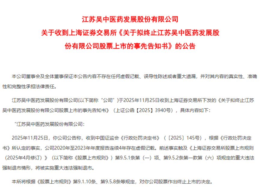 2025年11月26日,江苏吴中医药发展股份有限公司(*ST苏吴,证券代码:600200)披露重磅公告,正式收到中国证监会《行政处罚决定书》。监管调查查实三项重大违法事实,首先是控制权信息持续造假:2018年2月公司控股股东股权变更后,钱群山已实际掌控经营决策,但公司在2018至2023年六年年报中,均谎称钱群英为实际控制人,公然隐瞒核心控制权信息。