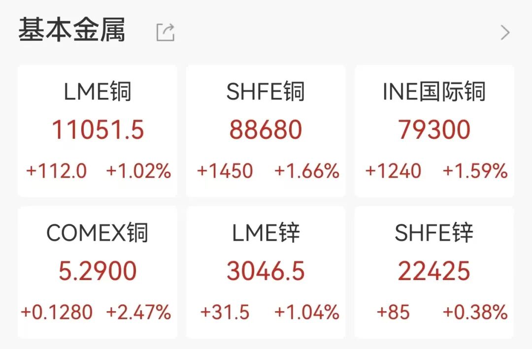 其他金属亦涨势突出,现货钯金日内大涨6%;LME铜价一度上涨2.5%,最高报11210美元/吨,突破10月高点,并创新高。