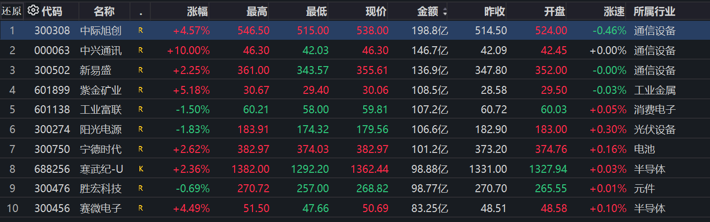 中际旭创成交额居首,为198.8亿元。其后是中兴通讯、新易盛、紫金矿业、工业富联,成交额分别为146.7亿元、136.9亿元、108.5亿元、107.2亿元。