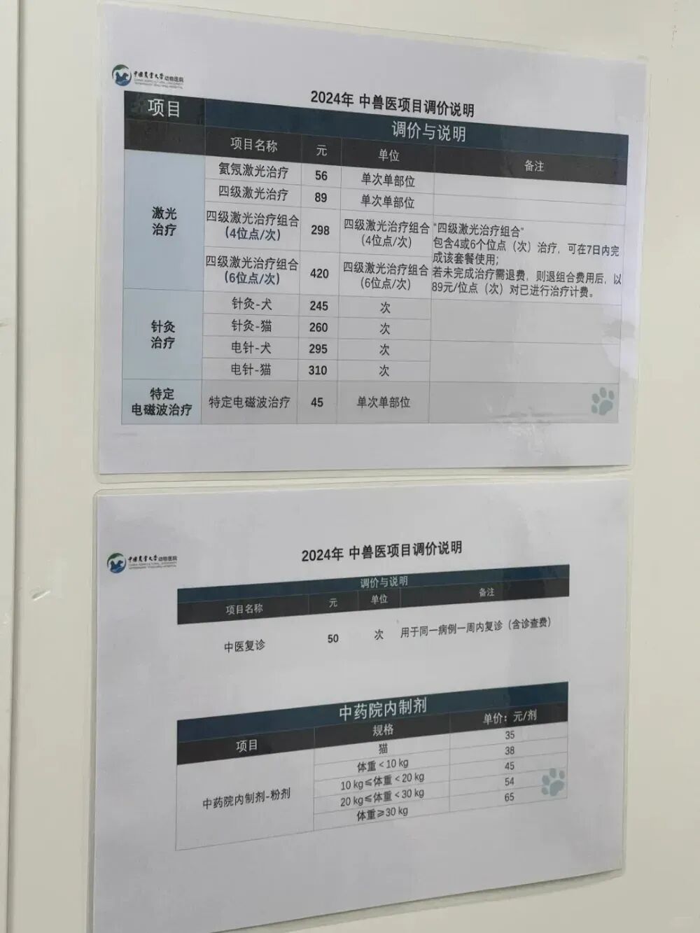 中国农业大学动物医院2024年中兽医项目调价说明