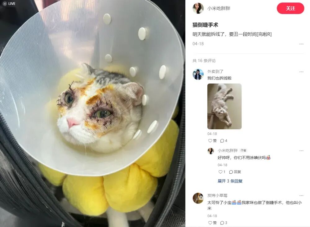 “我带我家二喵子绝育那天,旁边‘病床’躺着的小猫友就是割双眼皮。它的主人说的时候我都愣了,以为我听错了”。