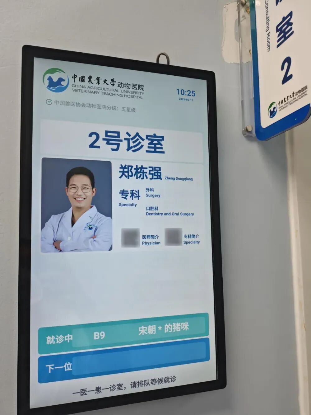 更有意思的是,与人类等号的过程中,三甲医院的叫号屏上直接显示的患者本人名字不同,中农动物医院的显示屏显示的可不只是毛孩子的名字还有宠物主人的名字。