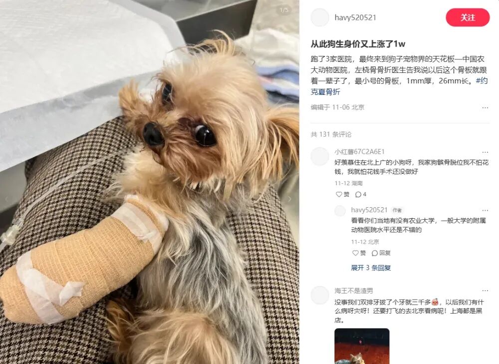 还有网友自家小约克夏骨折,跑了三家医院,最终在这里做了手术。不仅喜提最小号骨板,从此狗生身价也涨了1w。