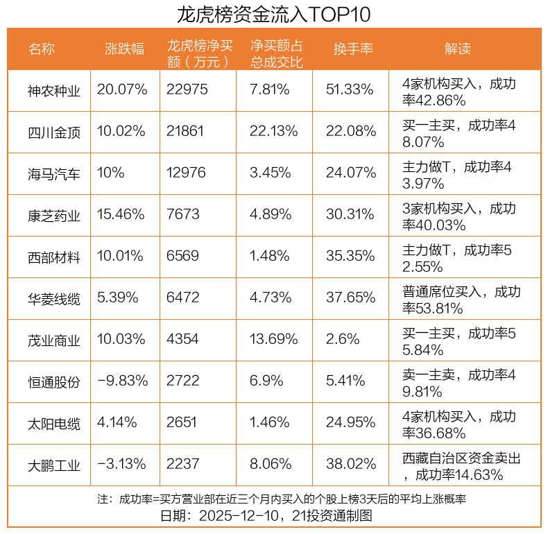 12月10日,上证指数下跌0.23%,深证成指上涨0.29%,创业板指下跌0.02%。盘后龙虎榜数据显示,共有43只个股因当日异动登上龙虎榜,资金净流入最多的是神农种业(300189.SZ),达2.3亿元。