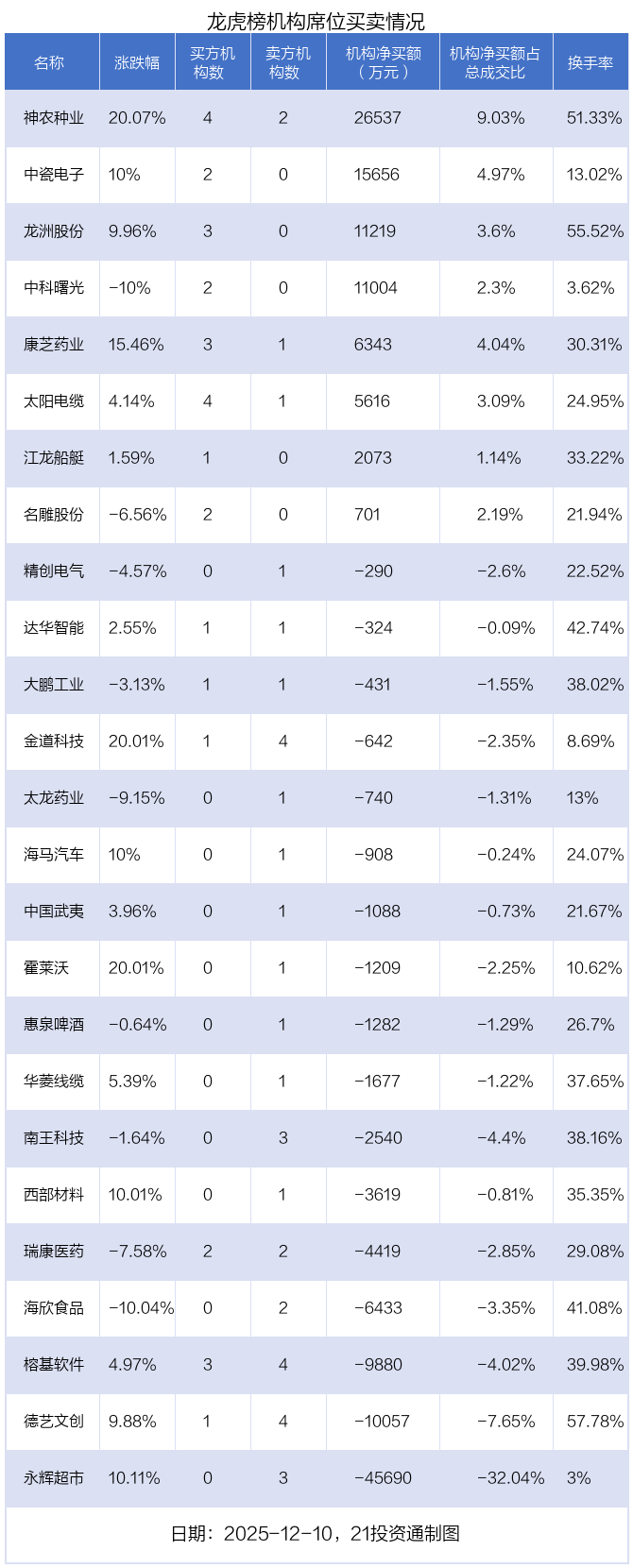 其中,机构净买入金额最多的是神农种业(300189.SZ),当日收盘上涨20.07%,换手率为51.33%。
