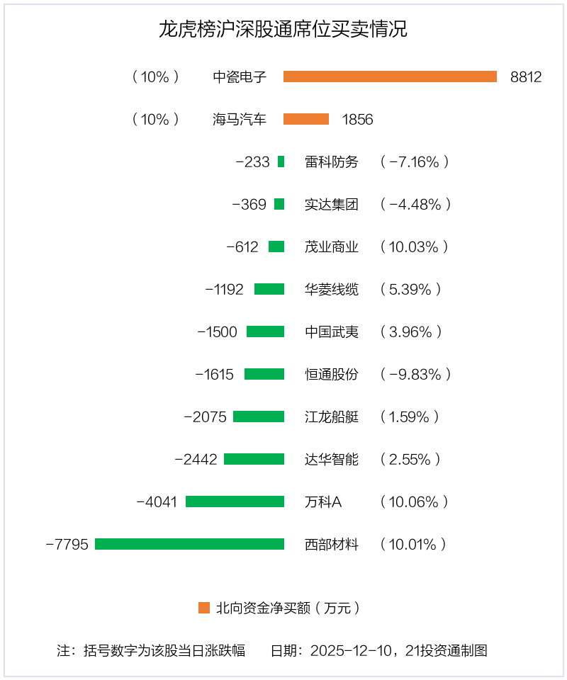 12月10日,北向资金参与龙虎榜中的个股共有12只,合计净卖出1.12亿元。其中沪股通净卖出3 股,合计净卖出2596.52万元;深股通净买入2 股,净卖出7 股,合计净卖出8611.01万元。