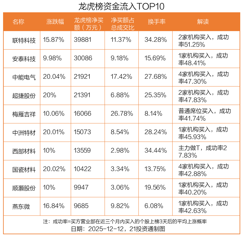 12月12日,上证指数上涨0.41%,深证成指上涨0.84%,创业板指上涨0.97%。盘后龙虎榜数据显示,共有51只个股因当日异动登上龙虎榜,资金净流入最多的是联特科技(301205.SZ),达3.99亿元。