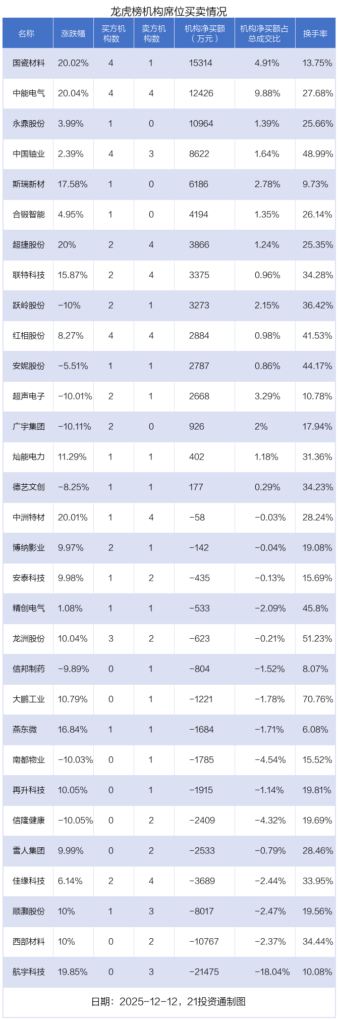 12月12日,31只个股龙虎榜出现了机构的身影,机构合计净买入2亿元。具体来看,机构净买入15股,净卖出16股。
