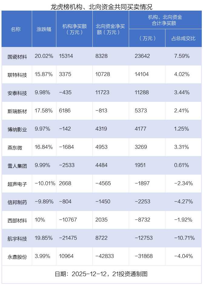 值得注意的是,机构和北向资金共同净买入了联特科技、国瓷材料等2股;共同净卖出了信邦制药;在安泰科技,航宇科技,燕东微,雪人集团,博纳影业,西部材料,斯瑞新材,超声电子,永鼎股份上出现分歧,机构净卖出安泰科技434.68万元,北向资金净买入1.17亿元;机构净卖出航宇科技2.15亿元,北向资金净买入8721.9万元;机构净卖出燕东微1684.25万元,北向资金净买入4952.93万元;机构净卖出雪人集团2533.3万元,北向资金净买入4484.23万元;机构净卖出博纳影业141.93万元,北向资金净买入4319.06万元;机构净卖出西部材料1.08亿元,北向资金净买入2034.56万元;机构净买入斯瑞新材6186.4万元,北向资金净卖出813万元;机构净买入超声电子2667.58万元,北向资金净卖出4564.65万元;机构净买入永鼎股份1.1亿元,北向资金净卖出4.28亿元。
